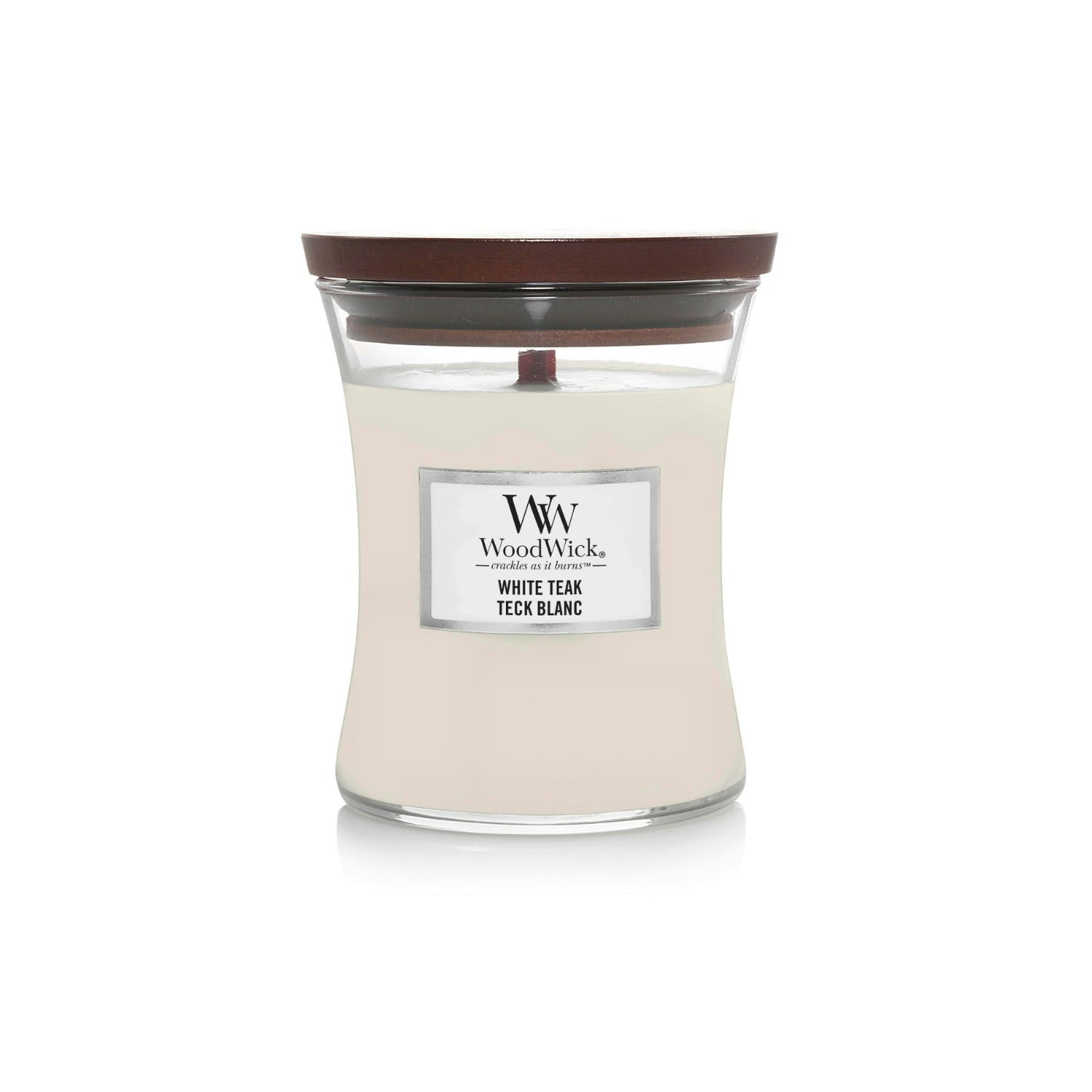Candela Clessidra Media con stoppino in legno Pluswick®, progettato per produrre un leggero crepitio durante la combustione. Realizzata con una miscela di cera di soia e paraffina, ha una durata fino a 60–70 ore.