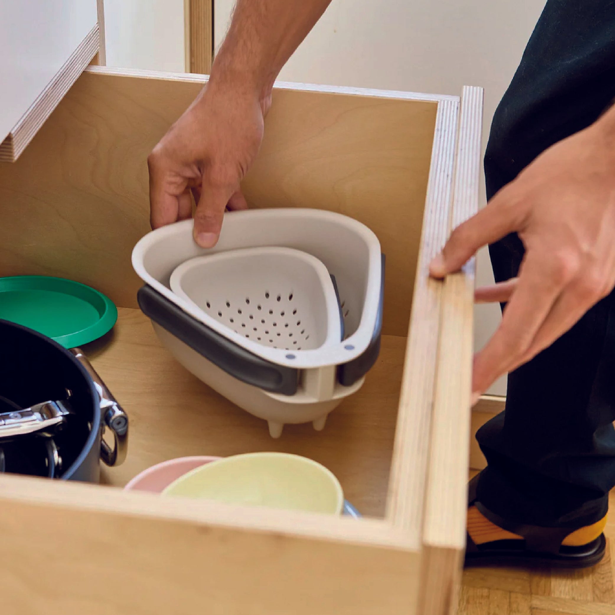 Lo scolapasta “Droplet” di Joseph Joseph unisce funzionalità compatta e design intelligente. I suoi manici pieghevoli permettono di risparmiare spazio nei cassetti e nei pensili, mentre la base stabile e le ampie forature assicurano un drenaggio veloce e omogeneo.
